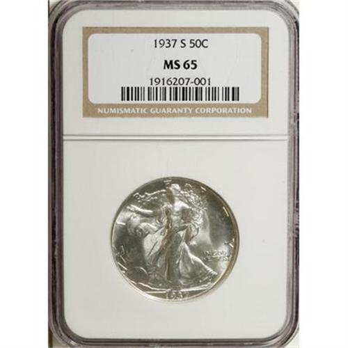 <B>1937-S 50C MS65 NGC.</B></I> This is a lovely, supremely lustrous, brilliant Premium Gem. Liberty's branch hand is the only design element that seems a bit softly defined. A couple of milky spots are noted in the lower left obverse field area, but they are very faint. Surface marks are minimal for the grade. <BR><BR><B>Coin Engraver:</B> Adolph A. Weinman<BR><BR><b>Shipping:</b> Coins & Currency (<a target="_blank" href="http://www.heritageauctions.com/common/shipping.php">view shipping information</a>)