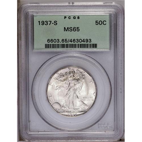 <B>1937-S<50C> MS65 PCGS.</B></I> Sharply struck, with dazzling luster, and a light veneer of champagne color bathes each side. A few minor obverse marks are mentioned for accuracy. <BR><BR><B>Important notice:</B> Heritage usually auctions material at the rate of 200-250 lots per hour. On some occasions eBay Live bid software or the Internet may not be able to keep up with the pace of the auction. We recommend placing a realistic absentee bid now as insurance to avoid disappointment. Occasionally the auctioneer may eliminate or reject an eBay Live bid, and the auctioneer may also reopen a lot after the close of the eBay live bidding (usually because we missed an audience bid), and may reject your bid even if it shows you as the winning bidder. By bidding via eBay Live, you agree that Heritage may award the lot to another bidder at its sole discretion under the circumstances described above or any other reasonable circumstances. Since eBay bids are not shown to us until we open the lot on the floor, we treat those bids just like floor bids. In most cases the floor responds before the eBay bid is presented to us, due to Internet lag time, so for consistency we have made it a policy that floor bids are always considered first over tie eBay live bids. Also please note that all Heritage lots purchased through eBay Live carry a 20% Buyer's Premium. Please make sure you read the Terms and Conditions before you bid. This lot is being auctioned in conjunction with a live floor auction by Heritage Galleries & Auctioneers. All final auction and invoice information will be supplied by Heritage Galleries & Auctioneers, and all other information should be considered preliminary. Lot:2964 <BR><BR><B>Winning Notification and Billing:</B> After the FINAL session in this auction is complete, Heritage will send e-mail and snail mail invoices. This process normally takes several days. All final auction and invoice information will be supplied by Heritage Galleries & Auctioneers, and all other information should be considered preliminary. <BR><BR>This auction will be conducted on a live auction floor and over the Internet through eBay Live. If you choose to place an absentee bid, please take a moment to <font color='#0000ff'><u><a href='http://pages.ebay.com/liveauctions/help/before/laabsentee.html'>learn how eBay Live absentee bidding works</a></u></font><font color='#000000'>