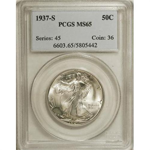 <B>1937-S 50C MS65 PCGS.</B></I> This pretty S-mint Gem exhibits strong luster and delicate champagne and powder-blue patina over each side. Well struck with few of the tiny flaws one might expect on a coin in this grade.<BR><I>From The Vanek Collection.</B></I><BR><BR><b>Shipping:</b> Coins & Currency (<a target="_blank" href="http://www.heritageauctions.com/common/shipping.php">view shipping information</a>)