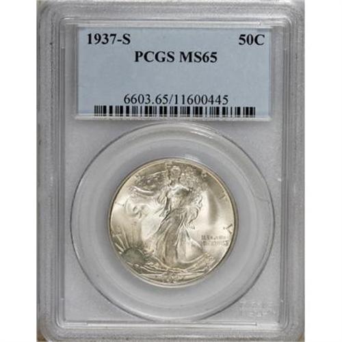 <B>1937-S 50C MS65 PCGS.</B></I> PCGS Population (719/293). NGC Census: (370/112). Mintage: 2,090,000. Numismedia Wsl. Price for NGC/PCGS coin in MS65: $815. (#6603)<BR><BR><B>Coin Engraver:</B> Adolph A. Weinman<BR><BR><b>Shipping:</b> Coins & Currency (<a target="_blank" href="http://www.heritageauctions.com/common/shipping.php">view shipping information</a>\)