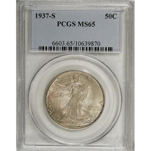 <B>1937-S 50C MS65 PCGS.</B></I> Glowing luster exudes from beige-gold surfaces laced with tinges of powder-blue. Generally well struck, with no marks worthy of individual mention.<BR><BR><B>Coin Engraver:</B> Adolph A. Weinman<BR><BR><b>Shipping:</b> Coins & Currency (<a target="_blank" href="http://www.heritageauctions.com/common/shipping.php">view shipping information</a>)