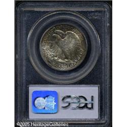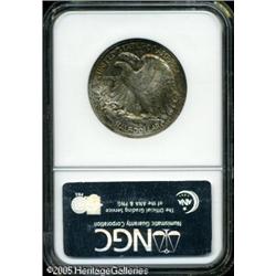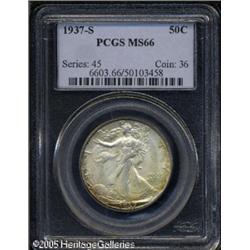 <B>1937-S 50C MS66 NGC.</B></I> A crescent of olive-gold and russet toning partially outlines milky gray obverse surfaces, while swaths of mottled reddish-brown toning invigorate the reverse. Lot:8059