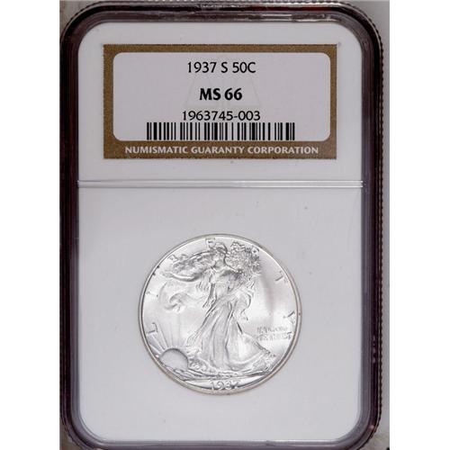 <B>1937-S<50C> MS66 NGC.</B></I> This flashy S-mint displays an excellent strike, with nice definition on the left thumb and in the gown lines. Both sides are essentially untoned. A few minor marks in the right (facing) obverse field and on the eagle's left wing are mentioned for accuracy. Census: 110 in 66, 6 finer (2/06).