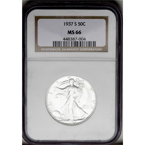 <B>1937-S<50C> MS66 NGC.</B></I> This low mintage and brilliant Premium Gem displays dazzling luster, and is void of detectable contact. A decent strike, although the highpoints lack absolute detail, as usual for the issue. <BR><BR><B>Important notice:</B> Heritage usually auctions material at the rate of 200-250 lots per hour. On some occasions eBay Live bid software or the Internet may not be able to keep up with the pace of the auction. We recommend placing a realistic absentee bid now as insurance to avoid disappointment. Occasionally the auctioneer may eliminate or reject an eBay Live bid, and the auctioneer may also reopen a lot after the close of the eBay live bidding (usually because we missed an audience bid), and may reject your bid even if it shows you as the winning bidder. By bidding via eBay Live, you agree that Heritage may award the lot to another bidder at its sole discretion under the circumstances described above or any other reasonable circumstances. Since eBay bids are not shown to us until we open the lot on the floor, we treat those bids just like floor bids. In most cases the floor responds before the eBay bid is presented to us, due to Internet lag time, so for consistency we have made it a policy that floor bids are always considered first over tie eBay live bids. Also please note that all Heritage lots purchased through eBay Live carry a 20% Buyer's Premium. Please make sure you read the Terms and Conditions before you bid. This lot is being auctioned in conjunction with a live floor auction by Heritage Galleries & Auctioneers. All final auction and invoice information will be supplied by Heritage Galleries & Auctioneers, and all other information should be considered preliminary. Lot:2967 <BR><BR><B>Winning Notification and Billing:</B> After the FINAL session in this auction is complete, Heritage will send e-mail and snail mail invoices. This process normally takes several days. All final auction and invoice information will be supplied by Heritage Galleries & Auctioneers, and all other information should be considered preliminary. <BR><BR>This auction will be conducted on a live auction floor and over the Internet through eBay Live. If you choose to place an absentee bid, please take a moment to <font color='#0000ff'><u><a href='http://pages.ebay.com/liveauctions/help/before/laabsentee.html'>learn how eBay Live absentee bidding works</a></u></font><font color='#000000'>