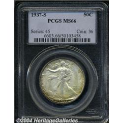 <B>1937-S<50C> MS66 PCGS.</B></I> Russet and violet toning adheres to each side, being a shade or two deeper on the reverse. The strike is average for the date. Four or five small marks are found on Liberty's portrait, none of which are particularly bothersome. <BR><BR><B>Important notice:</B> Heritage usually auctions material at the rate of 200-250 lots per hour. On some occasions eBay Live bid software or the Internet may not be able to keep up with the pace of the auction. We recommend placing a realistic absentee bid now as insurance to avoid disappointment. Occasionally the auctioneer may eliminate or reject an eBay Live bid, and the auctioneer may also reopen a lot after the close of the eBay live bidding (usually because we missed an audience bid), and may reject your bid even if it shows you as the winning bidder. By bidding via eBay Live, you agree that Heritage may award the lot to another bidder at its sole discretion under the circumstances described above or any other reasonable circumstances. Since eBay bids are not shown to us until we open the lot on the floor, we treat those bids just like floor bids. In most cases the floor responds before the eBay bid is presented to us, due to Internet lag time, so for consistency we have made it a policy that floor bids are always considered first over tie eBay live bids. Also please note that all Heritage lots purchased through eBay Live carry a 20% Buyer's Premium. Please make sure you read the Terms and Conditions before you bid. </span></font></tr></table></td></tr></table>