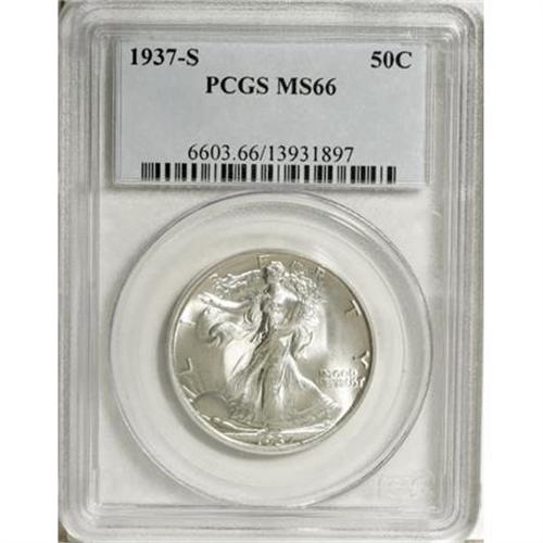 <B>1937-S 50C MS66 PCGS.</B></I> Strongly lustrous with surprisingly little patina, an attractive example of this S-mint issue. Well struck with occasional hints of peach in the fields. PCGS has graded 17 coins finer (10/07).<BR><BR><B>Coin Engraver:</B> Adolph A. Weinman<BR><BR><b>Shipping:</b> Coins & Currency (<a target="_blank" href="http://www.heritageauctions.com/common/shipping.php">view shipping information</a>)