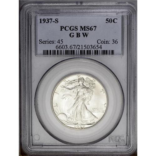 <B>1937-S<50C> MS67 PCGS.</B></I> Ex: GBW. This is a true rarity in such a high grade, one of just 16 such coins certified by PCGS. Both sides are highly lustrous with frosty and brilliant-silver surfaces. Sharply struck, including a full thumb and strong skirt lines. Rarely offered in such a superior grade, and a real object of beauty. Population: 16 in 67, 0 finer (3/06). <BR><BR><B>Important notice:</B> Heritage usually auctions material at the rate of 200-250 lots per hour. On some occasions eBay Live bid software or the Internet may not be able to keep up with the pace of the auction. We recommend placing a realistic absentee bid now as insurance to avoid disappointment. Occasionally the auctioneer may eliminate or reject an eBay Live bid, and the auctioneer may also reopen a lot after the close of the eBay live bidding (usually because we missed an audience bid), and may reject your bid even if it shows you as the winning bidder. By bidding via eBay Live, you agree that Heritage may award the lot to another bidder at its sole discretion under the circumstances described above or any other reasonable circumstances. Since eBay bids are not shown to us until we open the lot on the floor, we treat those bids just like floor bids. In most cases the floor responds before the eBay bid is presented to us, due to Internet lag time, so for consistency we have made it a policy that floor bids are always considered first over tie eBay live bids. Also please note that all Heritage lots purchased through eBay Live carry a 20% Buyer's Premium. Please make sure you read the Terms and Conditions before you bid. This lot is being auctioned in conjunction with a live floor auction by Heritage Galleries & Auctioneers. All final auction and invoice information will be supplied by Heritage Galleries & Auctioneers, and all other information should be considered preliminary. Lot:2969 <BR><BR><B>Winning Notification and Billing:</B> After the FINAL session in this auction is complete, Heritage will send e-mail and snail mail invoices. This process normally takes several days. All final auction and invoice information will be supplied by Heritage Galleries & Auctioneers, and all other information should be considered preliminary. <BR><BR>This auction will be conducted on a live auction floor and over the Internet through eBay Live. If you choose to place an absentee bid, please take a moment to <font color='#0000ff'><u><a href='http://pages.ebay.com/liveauctions/help/before/laabsentee.html'>learn how eBay Live absentee bidding works</a></u></font><font color='#000000'>