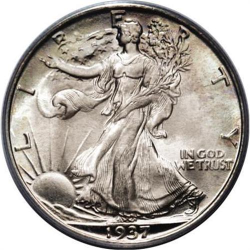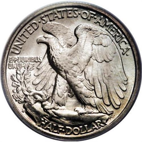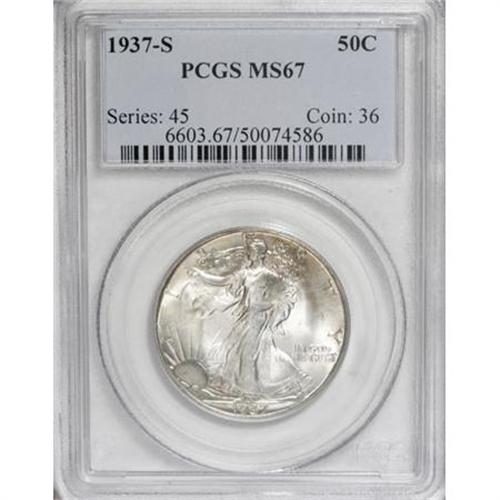 <B>1937-S 50C MS67 PCGS.</B></I> Light chestnut toning graces both sides of this lustrous and beautifully preserved Superb Gem. The strike is decidedly above average for a San Francisco Walker, since the head is needle-sharp and the skirt lines are nearly complete. The thumb is separated, although the branch hand does show the expected blending of detail. Population: 17 in 67, 0 finer (6/07). <BR><BR><B>Coin Engraver:</B> Adolph A. Weinman<BR><BR><b>Shipping:</b> Coins & Currency (<a target="_blank" href="http://www.heritageauctions.com/common/shipping.php">view shipping information</a>\)