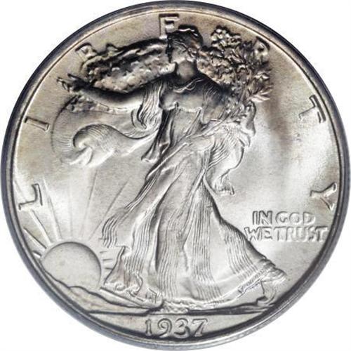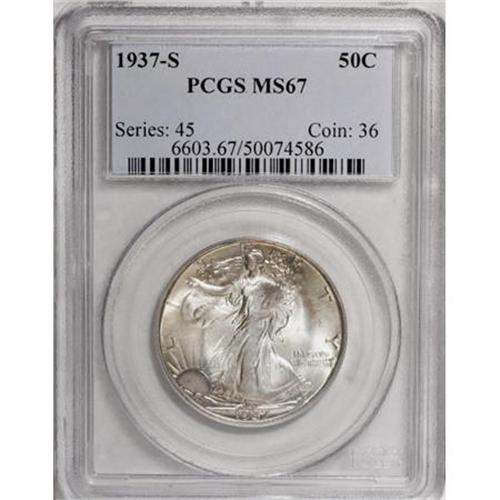 <B>1937-S 50C MS67 PCGS.</B></I> Light chestnut toning graces both sides of this lustrous and beautifully preserved Superb Gem. The strike is decidedly above average for a San Francisco Walker, since the head is needle-sharp and the skirt lines are nearly complete. The thumb is separated, although the branch hand does show the expected blending of detail. Population: 17 in 67, 0 finer (10/07).<BR><BR><B>Coin Engraver:</B> Adolph A. Weinman<BR><BR><b>Shipping:</b> Coins & Currency (<a target="_blank" href="http://www.heritageauctions.com/common/shipping.php">view shipping information</a>)
