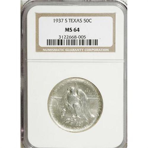 <B>1937-S 50C Texas MS64 NGC.</B></I> . NGC Census: (144/869). PCGS Population (334/1028). Mintage: 6,637. Numismedia Wsl. Price for NGC/PCGS coin in MS64: $142. (#9392)<BR><BR><b>Shipping:</b> Coins & Currency (<a target="_blank" href="http://www.heritageauctions.com/common/shipping.php">view shipping information</a>)