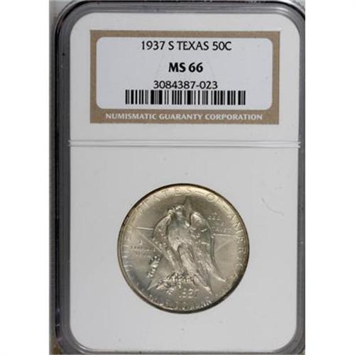 <B>1937-S 50C Texas MS66 NGC.</B></I> NGC Census: (398/78). PCGS Population (373/71). Mintage: 6,637. Numismedia Wsl. Price for NGC/PCGS coin in MS66: $380. (#9392)<BR><BR><b>Shipping:</b> Coins & Currency (<a target="_blank" href="http://www.heritageauctions.com/common/shipping.php">view shipping information</a>)