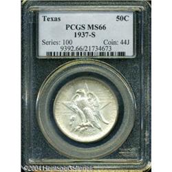 1937-S 50C Texas MS66 PCGS. Faint touches of olive <B>1937-S 50C Texas MS66 PCGS.</B></I> Faint touches of olive-gold adhere to lustrous surfaces that are virtually mark free. The design features are well impressed throughout. <BR><BR><B>Important notice:</B> Heritage usually auctions material at the rate of 200-250 lots per hour. On some occasions eBay Live bid software or the Internet may not be able to keep up with the pace of the auction. We recommend placing a realistic absentee bid now as insurance to avoid disappointment. Occasionally the auctioneer may eliminate or reject an eBay Live bid, and the auctioneer may also reopen a lot after the close of the eBay live bidding (usually because we missed an audience bid), and may reject your bid even if it shows you as the winning bidder. By bidding via eBay Live, you agree that Heritage may award the lot to another bidder at its sole discretion under the circumstances described above or any other reasonable circumstances. Since eBay bids are not shown to us until we open the lot on the floor, we treat those bids just like floor bids. In most cases the floor responds before the eBay bid is presented to us, due to Internet lag time, so for consistency we have made it a policy that floor bids are always considered first over tie eBay live bids. Also please note that all Heritage lots purchased through eBay Live carry a 20% Buyer's Premium. Please make sure you read the Terms and Conditions before you bid. This lot is being auctioned in conjunction with a live floor auction by Heritage Galleries & Auctioneers. All final auction and invoice information will be supplied by Heritage Galleries & Auctioneers, and all other information should be considered preliminary. Lot:7950