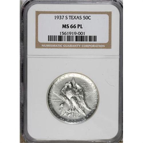 <B>1937-S 50C Texas MS66 Prooflike NGC.</B></I> This is a popular low mintage commemorative type that is rarely seen in Prooflike condition. In fact, just eight pieces have been certified as Prooflike by NGC, and the current example is highest-graded of those and the only one at MS66 (5/07). It is sharply struck and untoned, with some wispy die polish lines on the obverse and well preserved, blemish-free surfaces. <BR><BR><b>Shipping:</b> Coins & Currency (<a target="_blank" href="http://www.heritageauctions.com/common/shipping.php">view shipping information</a>)