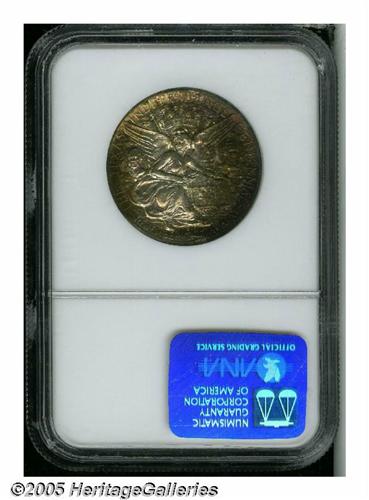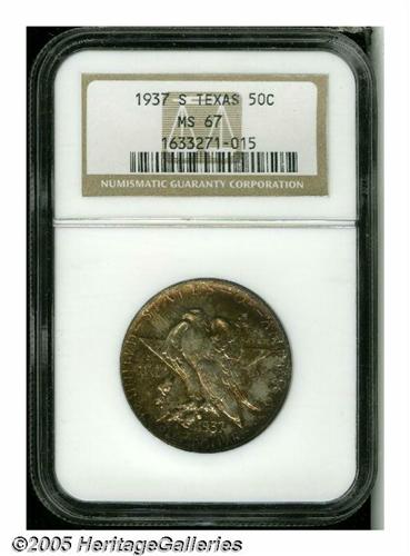<B>1937-S<50C> Texas MS67 NGC.</B></I> This very attractive Texas commemorative displays splashes of burgundy and orange-gold patina overlaying lustrous surfaces. The design features are sharply defined, and the surfaces are devoid of mentionable contact marks. Population: 58 in 67, 4 finer (5/05).