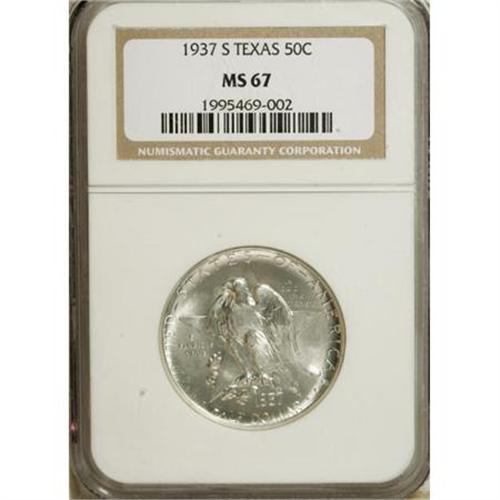 <B>1937-S 50C Texas MS67 NGC.</B></I> A shining silver-white representative of this low-mintage Texas issue, boldly struck and beautifully preserved. NGC has graded only five coins finer (3/08).<BR><I>From The Silver Spur Collection.</B></I><BR><BR><b>Shipping:</b> Coins & Currency (<a target="_blank" href="http://www.heritageauctions.com/common/shipping.php">view shipping information</a>)