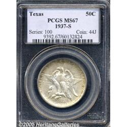 <B>1937-S 50C Texas MS67 PCGS.</B></I> Fully struck and seemingly pristine, with lovely apricot and olive peripheral toning, a small degree of speckled patina scattered over the obverse, and soft satiny luster. A pretty and essentially flawless Superb Gem. Population: 61 in 67, 0 finer (2/05).