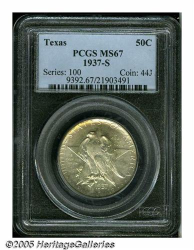 <B>1937-S<50C> Texas MS67 PCGS.</B></I> Lovely superb-Gem example with shifting light orange and red color. Suitably well preserved and bold. Population: 59 in 67, 0 finer (6/05).