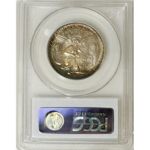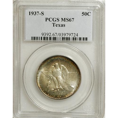 <B>1937-S 50C Texas MS67 PCGS.</B></I> One of the most beautifully toned examples of this statehood centennial issue, draped in tastefully arranged rings and bands of color. Pastel blue, sun-gold, and peach are just a few of the colors visible on each side. Tied for the finest graded by PCGS (4/07).<BR><BR><b>Shipping:</b> Coins & Currency (<a target="_blank" href="http://www.heritageauctions.com/common/shipping.php">view shipping information</a>)