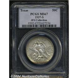 <B>1937-S<50C> Texas MS67 PCGS.</B></I> Freckles of deep russet-brown color endow the lower obverse border and the upper reverse periphery, however, the remainder of this lustrous Superb Gem features pastel honey-gold and cream-gray patina. A crisply struck and nearly immaculate example of this popular Statehood type. Population: 56 in 67, none finer (6/04).<BR><I>From the JFS Collection, the #1 All-Time PCGS Registry Set.</B></I> <BR><BR><B>Important notice:</B> Heritage usually auctions material at the rate of 200-250 lots per hour. On some occasions eBay Live bid software or the Internet may not be able to keep up with the pace of the auction. We recommend placing a realistic absentee bid now as insurance to avoid disappointment. Occasionally the auctioneer may eliminate or reject an eBay Live bid, and the auctioneer may also reopen a lot after the close of the eBay live bidding (usually because we missed an audience bid), and may reject your bid even if it shows you as the winning bidder. By bidding via eBay Live, you agree that Heritage may award the lot to another bidder at its sole discretion under the circumstances described above or any other reasonable circumstances. Since eBay bids are not shown to us until we open the lot on the floor, we treat those bids just like floor bids. In most cases the floor responds before the eBay bid is presented to us, due to Internet lag time, so for consistency we have made it a policy that floor bids are always considered first over tie eBay live bids. Also please note that all Heritage lots purchased through eBay Live carry a 20% Buyer's Premium. Please make sure you read the Terms and Conditions before you bid. </span></font></tr></table></td></tr></table>