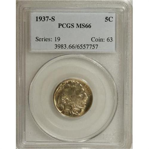 <B>1937-S 5C MS66 PCGS.</B></I> PCGS Population (1028/79). NGC Census: (799/38). Mintage: 5,635,000. Numismedia Wsl. Price for NGC/PCGS coin in MS66: $115. (#3983)<BR><BR><B>Coin Engraver:</B> James E. Fraser<BR><BR><b>Shipping:</b> Coins & Currency (<a target="_blank" href="http://www.heritageauctions.com/common/shipping.php">view shipping information</a>)