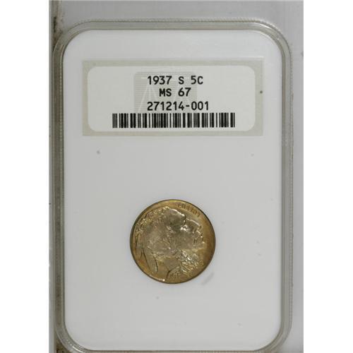 1937-S 5C MS67 NGC. Nicely detailed with strong luster