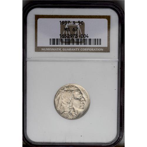 <B>1937-S<5C> MS67 NGC.</B></I> This exquisitely struck and magnificently preserved Superb Gem is delicately toned tan-gold, and represents the finest obtainable quality for the final S-mint issue. Census: 19 in 67, 0 finer (3/06).<BR><I>From The Alex & Nan Registry Sets.</B></I> <BR><BR><B>Important notice:</B> Heritage usually auctions material at the rate of 200-250 lots per hour. On some occasions eBay Live bid software or the Internet may not be able to keep up with the pace of the auction. We recommend placing a realistic absentee bid now as insurance to avoid disappointment. Occasionally the auctioneer may eliminate or reject an eBay Live bid, and the auctioneer may also reopen a lot after the close of the eBay live bidding (usually because we missed an audience bid), and may reject your bid even if it shows you as the winning bidder. By bidding via eBay Live, you agree that Heritage may award the lot to another bidder at its sole discretion under the circumstances described above or any other reasonable circumstances. Since eBay bids are not shown to us until we open the lot on the floor, we treat those bids just like floor bids. In most cases the floor responds before the eBay bid is presented to us, due to Internet lag time, so for consistency we have made it a policy that floor bids are always considered first over tie eBay live bids. Also please note that all Heritage lots purchased through eBay Live carry a 20% Buyer's Premium. Please make sure you read the Terms and Conditions before you bid. This lot is being auctioned in conjunction with a live floor auction by Heritage Galleries & Auctioneers. All final auction and invoice information will be supplied by Heritage Galleries & Auctioneers, and all other information should be considered preliminary. Lot:1142 <BR><BR><B>Winning Notification and Billing:</B> After the FINAL session in this auction is complete, Heritage will send e-mail and snail mail invoices. This process normally takes several days. All final auction and invoice information will be supplied by Heritage Galleries & Auctioneers, and all other information should be considered preliminary. <BR><BR>This auction will be conducted on a live auction floor and over the Internet through eBay Live. If you choose to place an absentee bid, please take a moment to <font color='#0000ff'><u><a href='http://pages.ebay.com/liveauctions/help/before/laabsentee.html'>learn how eBay Live absentee bidding works</a></u></font><font color='#000000'>