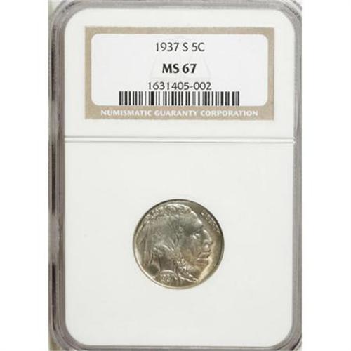 <B>1937-S 5C MS67 NGC.</B></I> Beautiful iridescent multicolored toning envelops lustrous surfaces. Sharply struck, with no mentionable contact marks. Census: 37 in 67, 1 finer (12/07).<BR><BR><B>Coin Engraver:</B> James E. Fraser<BR><BR><b>Shipping:</b> Coins & Currency (<a target="_blank" href="http://www.heritageauctions.com/common/shipping.php">view shipping information</a>)
