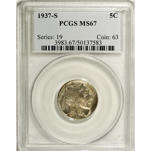 <B>1937-S 5C MS67 PCGS.</B></I> An outstanding Superb Gem that is sharply struck. Immaculately preserved surfaces display dazzling luster and a faint hint of light tan-gold color. Population: 75 in 67, 0 finer (12/06).<BR><BR><b>Shipping:</b> Coin/Currency (<a target="_blank" href="http://www.heritageauctions.com/common/shipping.php">view shipping information</a>)