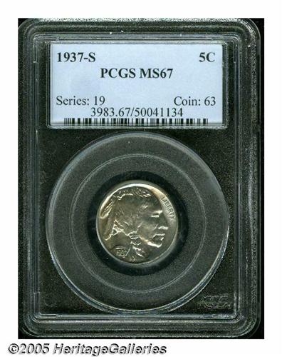 <B>1937-S<5C> MS67 PCGS.</B></I> Just a trifle weak on the reverse, but very sharply detailed on the obverse, this lightly toned Superb Gem displays pleasing silver-blue coloration and full satiny luster. The immaculately preserved surfaces are pristine. None have been graded any finer, by PCGS (3/05).