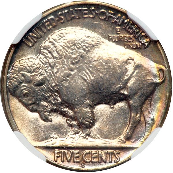 1937-S Buffalo Nickel. NGC graded MS-66. Star PQ. Wonderful rainbow toning. Stored in a Dansco Album for many years. A run-a-way coin. Pop 1; 24 finer, 23 in 67 Star, 1 in 68 Star.