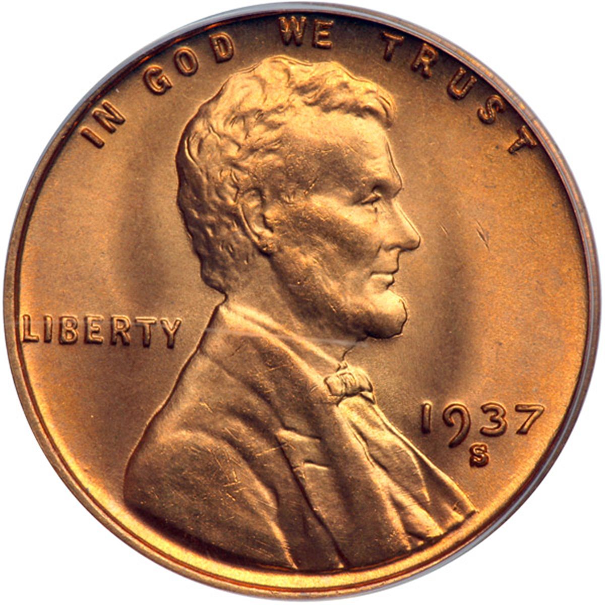 1937-S Lincoln Cent. PCGS graded MS-67 Red. Wonderful Mint Red color. Pop 153; 2 finer in 67+ (PCGS # 2665) .