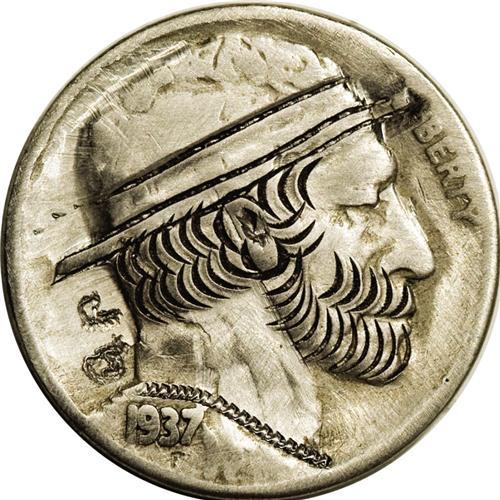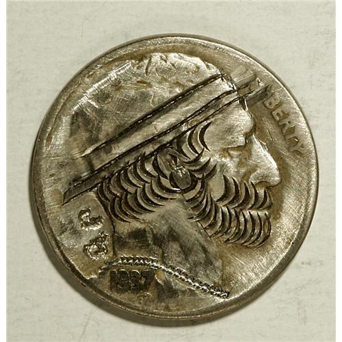 <B>1937-S:</B></I> This modern carving by John Dorusa represents about 90% of all hobo nickel subjects, a bearded man wearing a derby. An Average carving, it typifies this artist's work in the hair style, ear technique, nose, etc. The field is a bit more nicely dressed than on most, and it is signed J.D. behind the neck. The host coin is a Fine.<BR><BR><b>Shipping:</b> Coin/Currency (<a target="_blank" href="http://www.heritageauctions.com/common/shipping.php">view shipping information</a>)