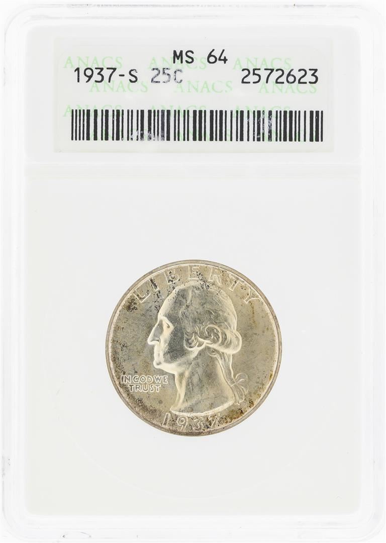 One 1937-S Washington Silver Quarter Coin ANACS MS64. ANACS Certified.