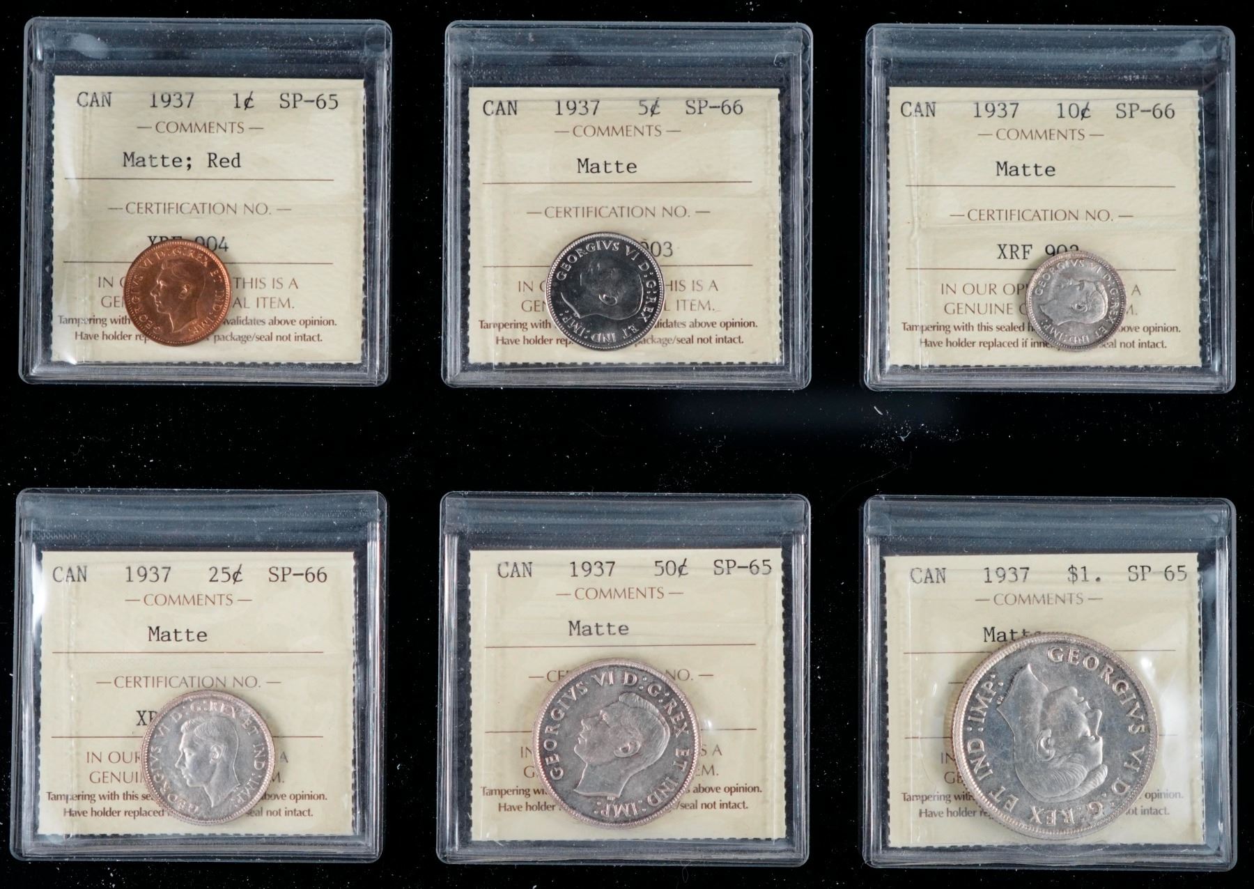 1937 SPECIMEN "MATTE" SET; A superb and complete 6 coin set. All ICCS graded Gem Mint State -65 to Superb Gem Mint State-66. The cent is Full Red and the silver coins are brilliant with great surfaces. Housed in deluxe homemade black leather case.