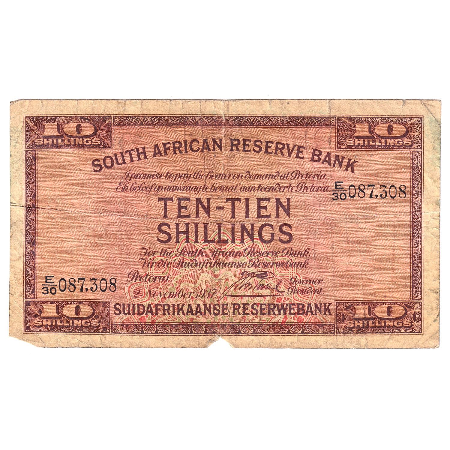 1937 South Africa 10 Shillings Pick #82d Fine (Note contains tears & 4 tiny pinholes on the right of the note).