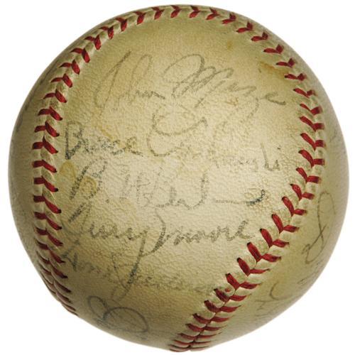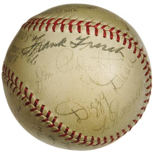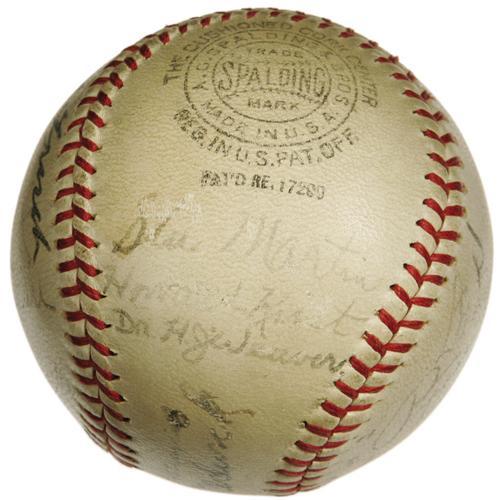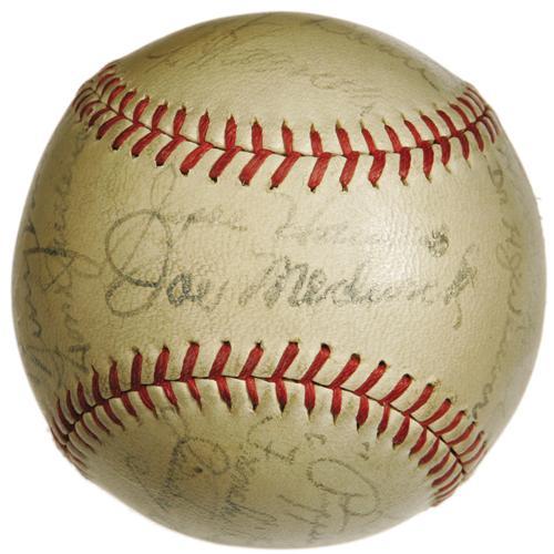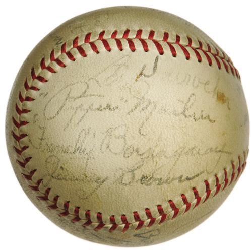 <B>1937 St. Louis Cardinals Team Signed Baseball.</B></I> Exceptional Hall of Fame talent leaves baseball historians scratching their heads, wondering how such a band of legends could fail to secure a National League flag! This ONL (Frick) ball documents this remarkable ensemble, with Dizzy Dean, Frisch, Durocher, Mize, Medwick, Haines and Martin among the eighteen autographs present. Signature quality averages 6/10 to 7/10, and the ball presents a mild, consistent degree of toning. <I>LOA from PSA/DNA. LOA from James Spence Authentication.</B></I><BR><BR><b>Shipping:</b> Balls, etc. (<a target="_blank" href="http://www.heritageauctions.com/common/shipping.php">view shipping information</a>)
