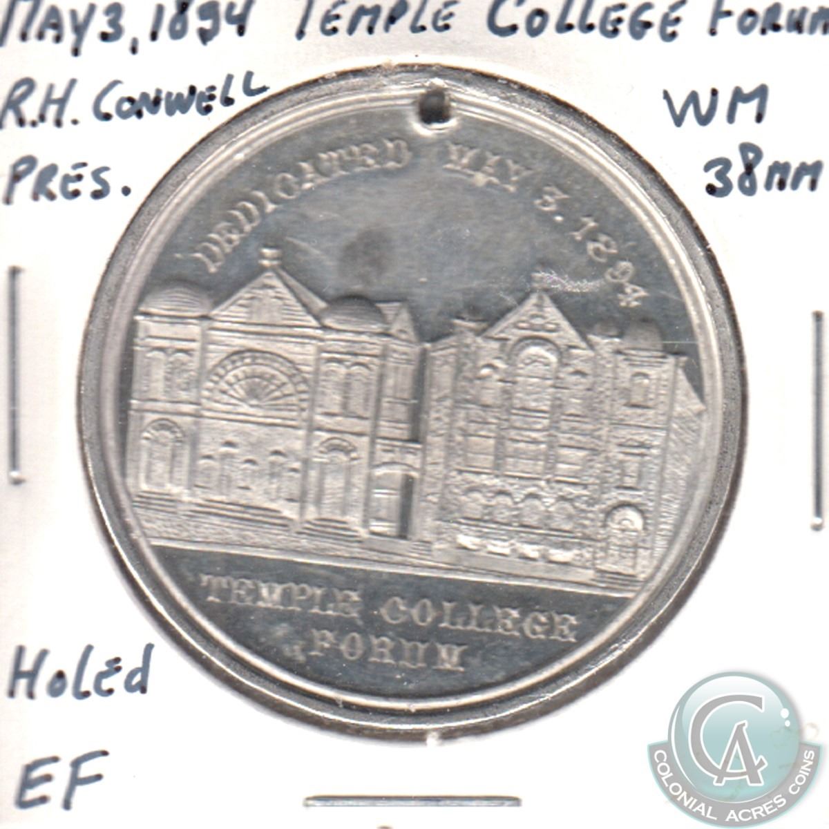1937 Temple College Forum R.H. Conwell Pres. 38mm Extra Fine