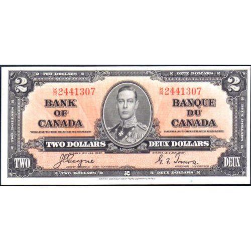 1937 Two Dollars, Coyne-Towers, BC-22c Serial Number K/R2441307, EF-AU. A little bit off centre toward the top and the right