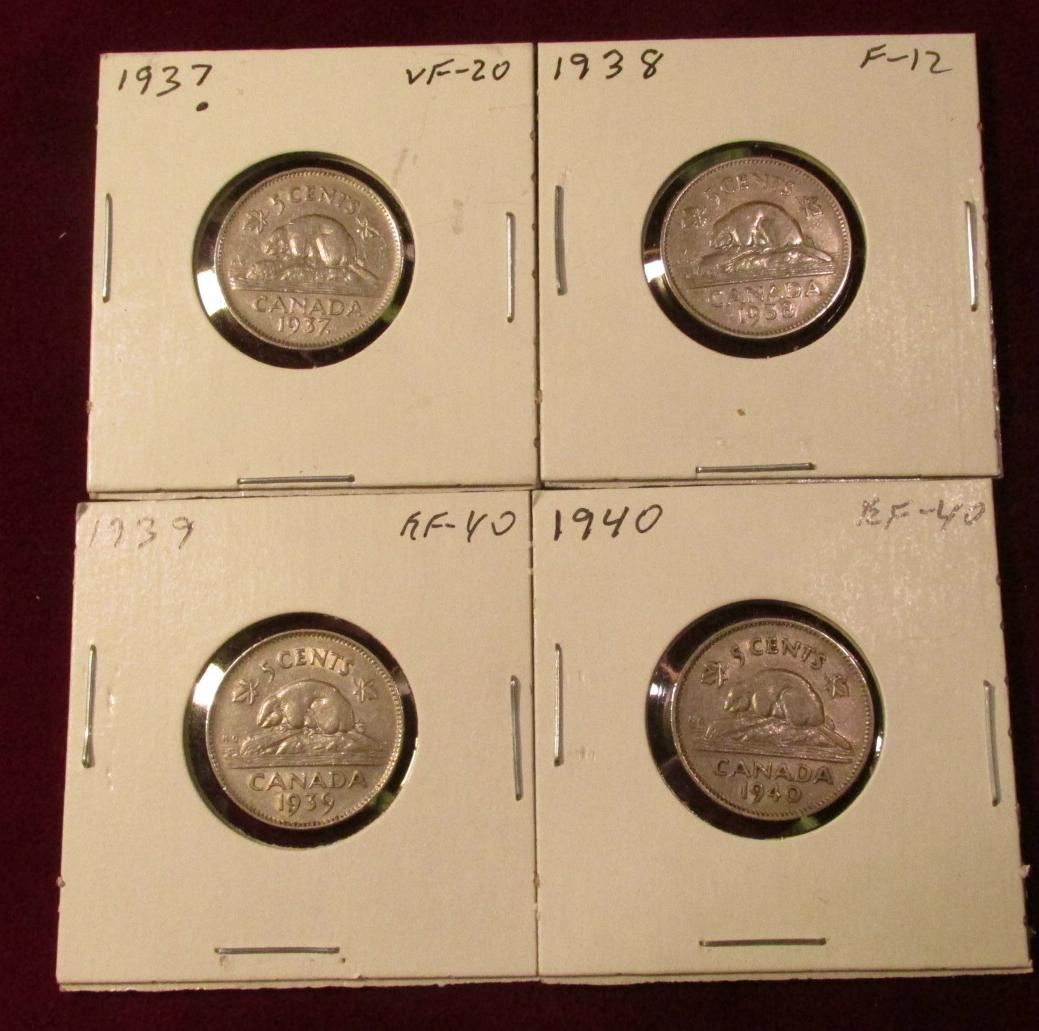 1937 VF, 38 F, 39 EF, & 40 EF Canada Nickels. Catalog Value $45.00.