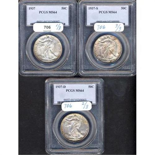 <b>1937 Walking Liberty PDS Set.</b> Includes: 1937 PCGS MS64, 1937-D PCGS MS64, and 1937-S PCGS MS64. Lot of 3 coins. <i>