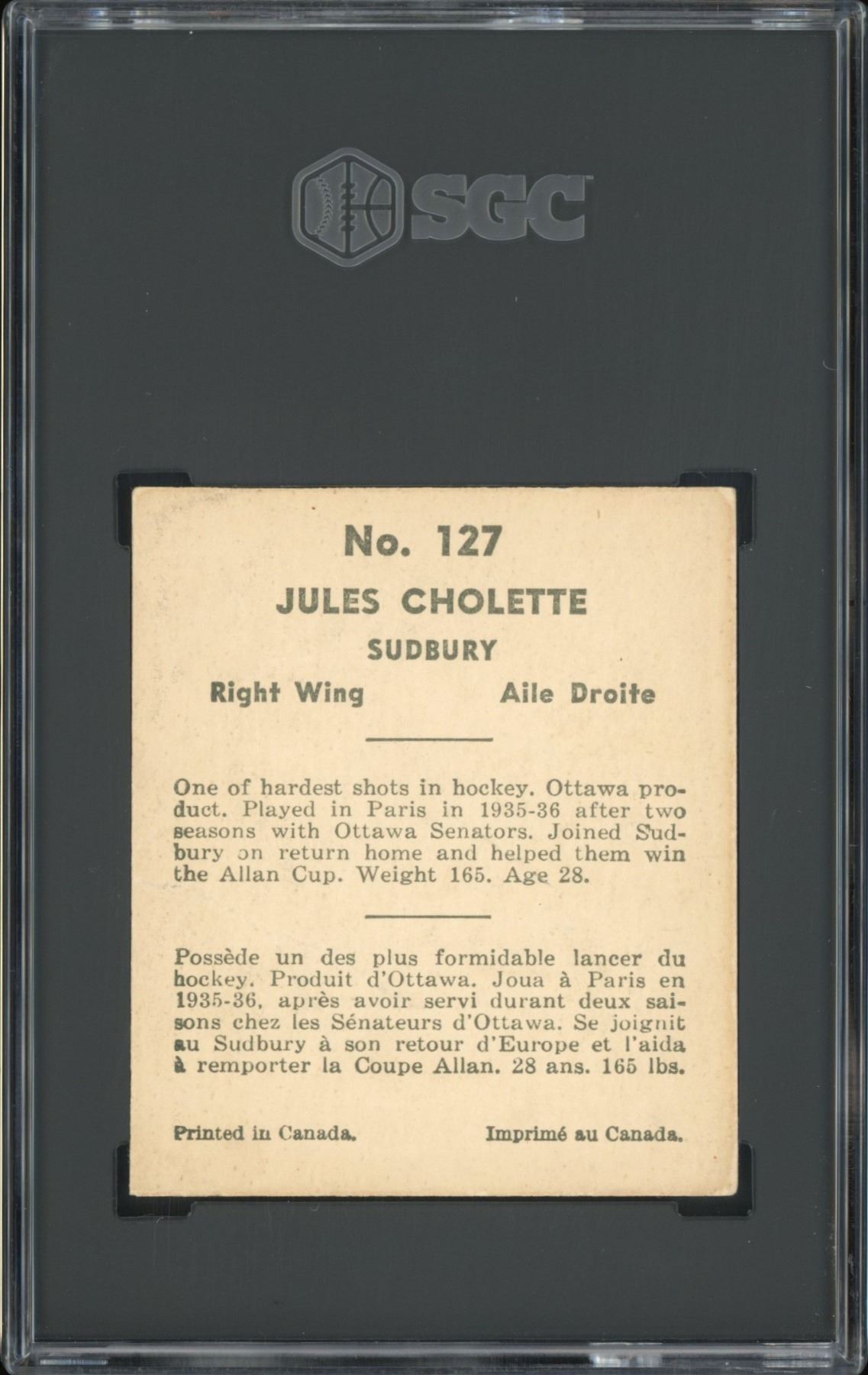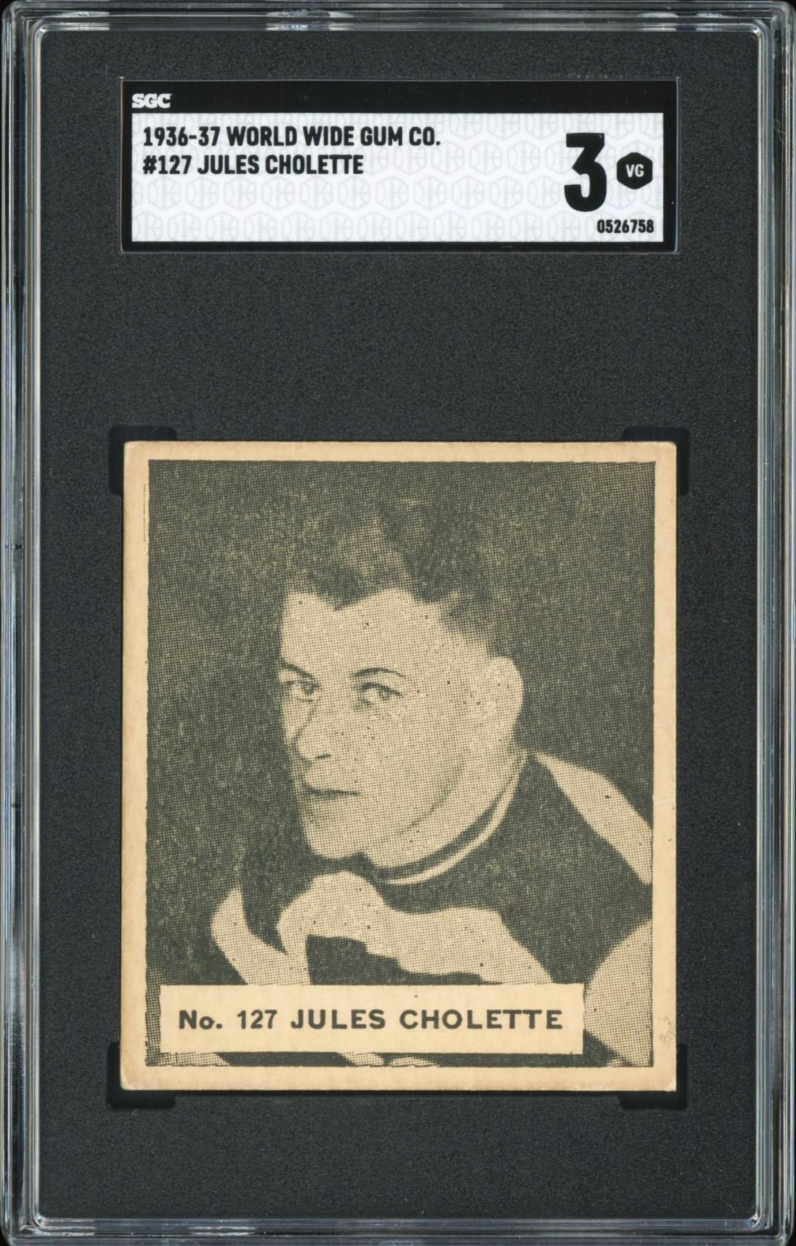 Very little info is available for this player. What we do know is this is 1 of 2 with 3 higher (5 total) in the SGC database, while PSA shows only 14 total. This appears to be Cholette's only card, and it is indeed a rare one. Graded 3 VG by SGC.