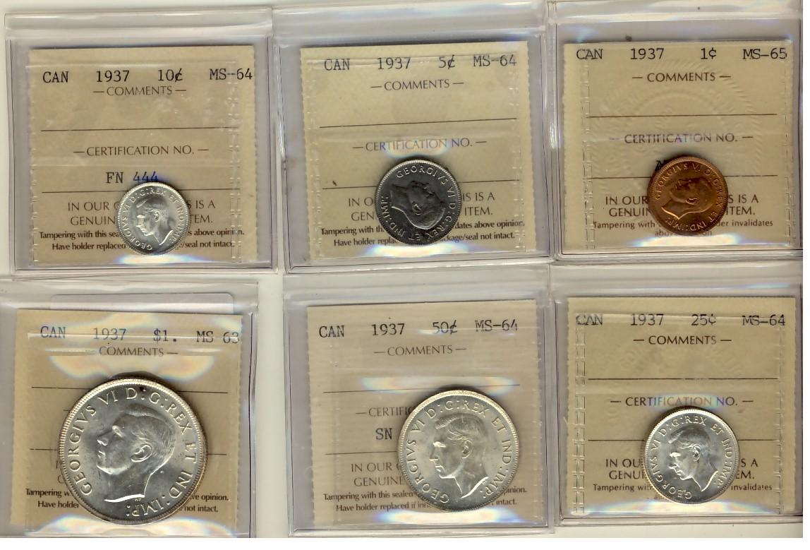1937 Year Set, includes 1¢ MS65, 5¢ MS64, 10¢ MS64, 25¢ MS64, 50¢ MS64 & $1 MS63. All coins brilliant and ICCS graded.