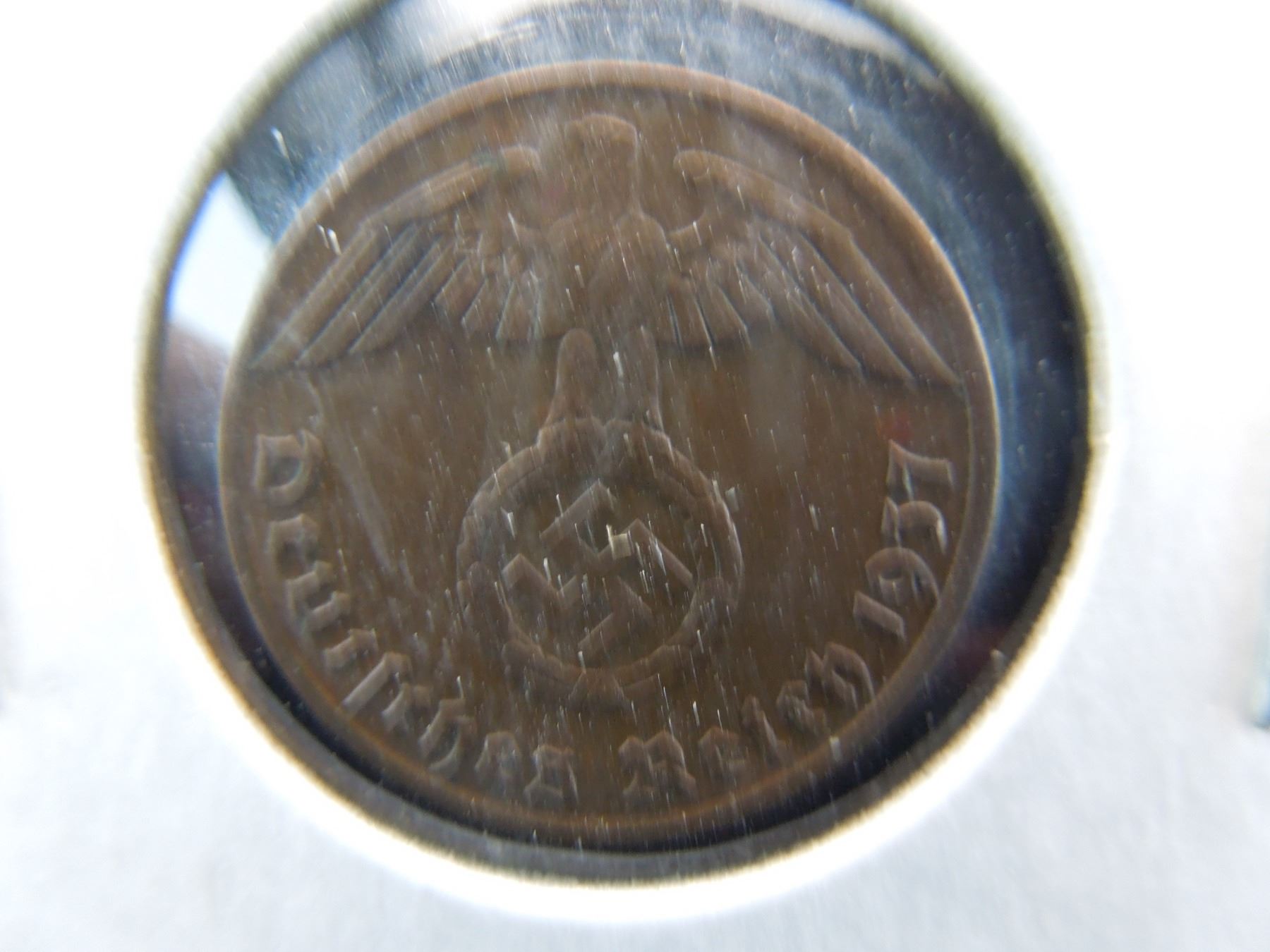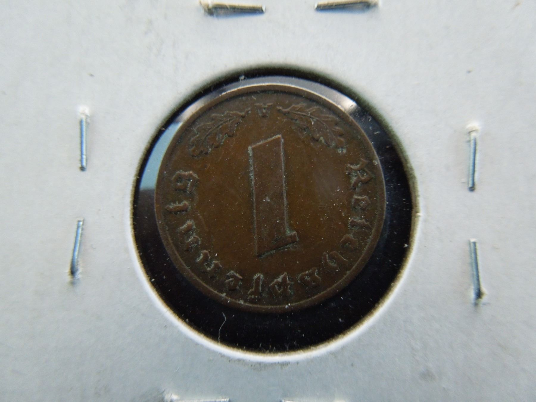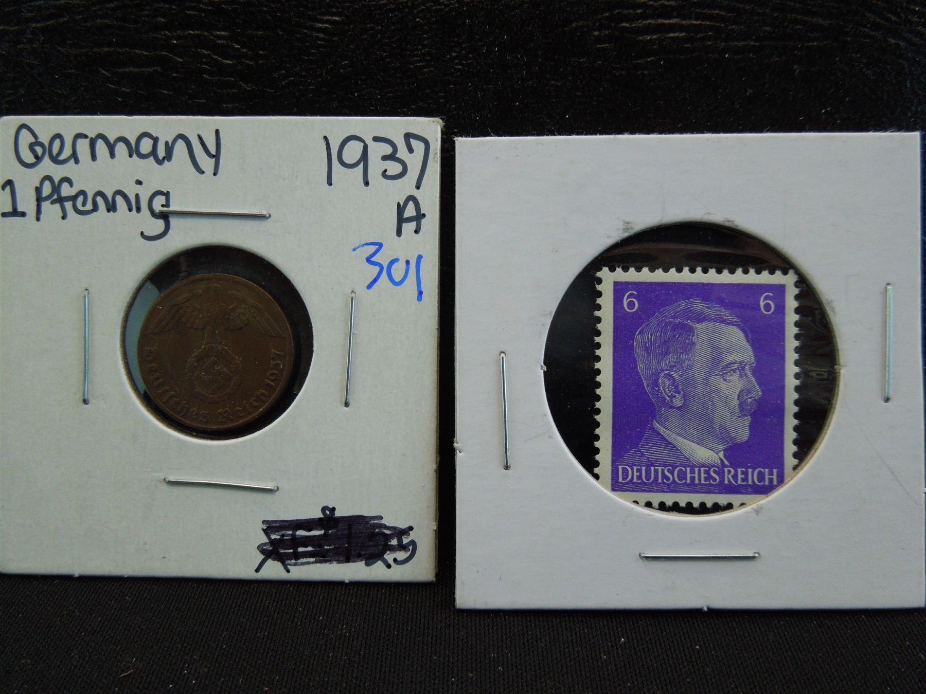1937-a one pfennig coin from germany with swastika and a hitler stamp