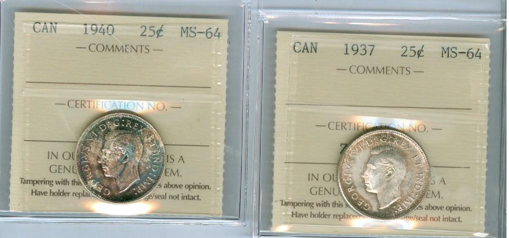 1937 and 1940 Lot of 2 ICCS graded 25¢ coins, both MS64 and