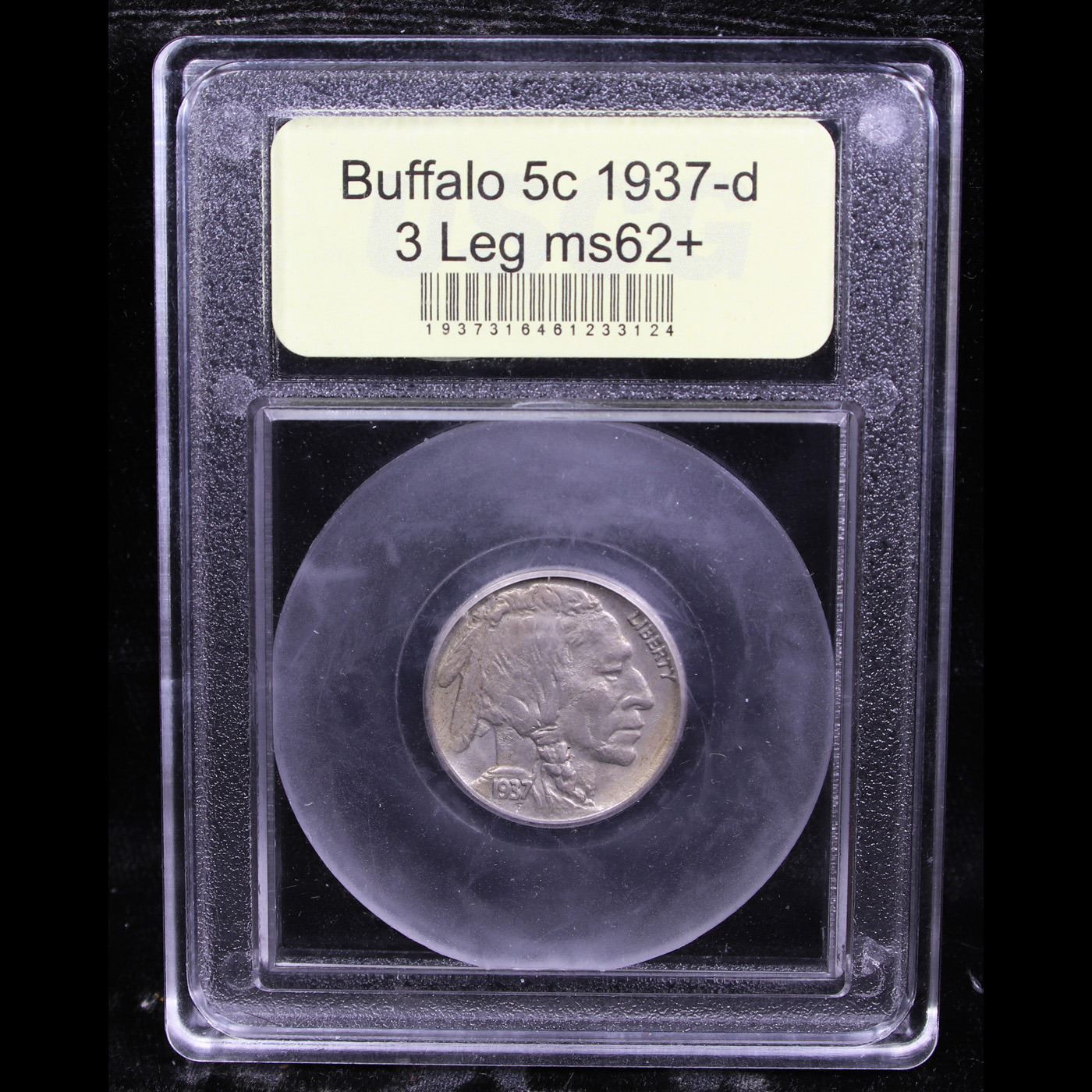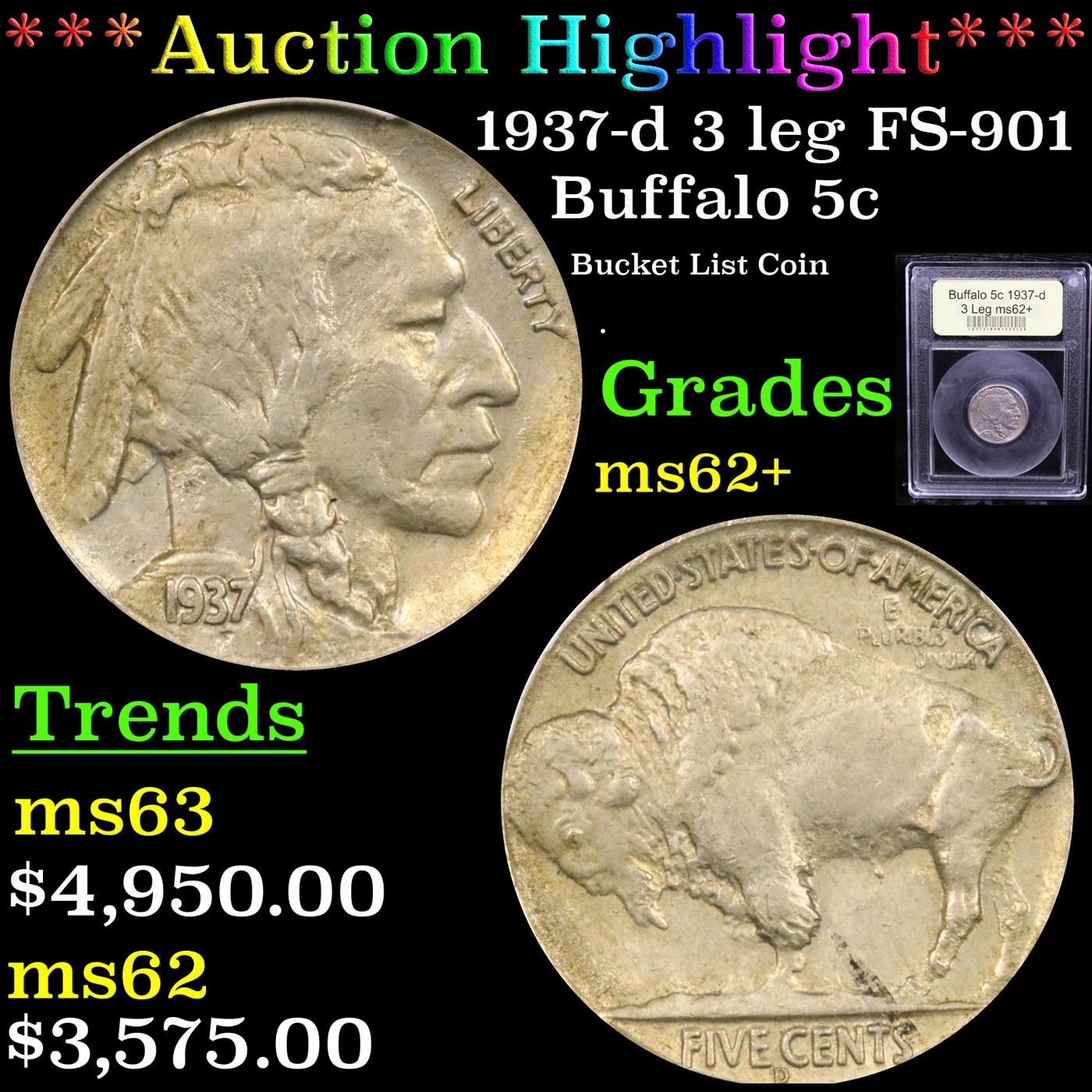 1937-d 3 leg FS-901 Buffalo Nickel 5c Graded Select Unc By USCG. The most sought after and heralded Buffalo, the 3 legged 1937-d. The die pair that struck this famous variety was heavily worn and eroded by the time that the reverse was polished down, effacing the bison's leg. The design elements and portions of the fields on both sides exhibit heavy metal flow and die fatigue. No major abrasions despite the modest numeric grade. A Corey's Pick, Bid to Win, Don't let it get Away Coin