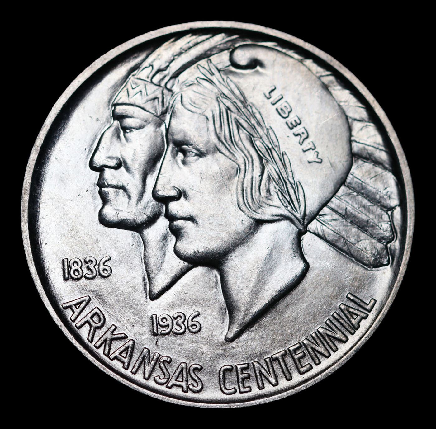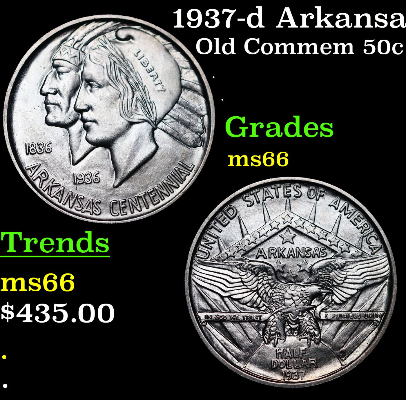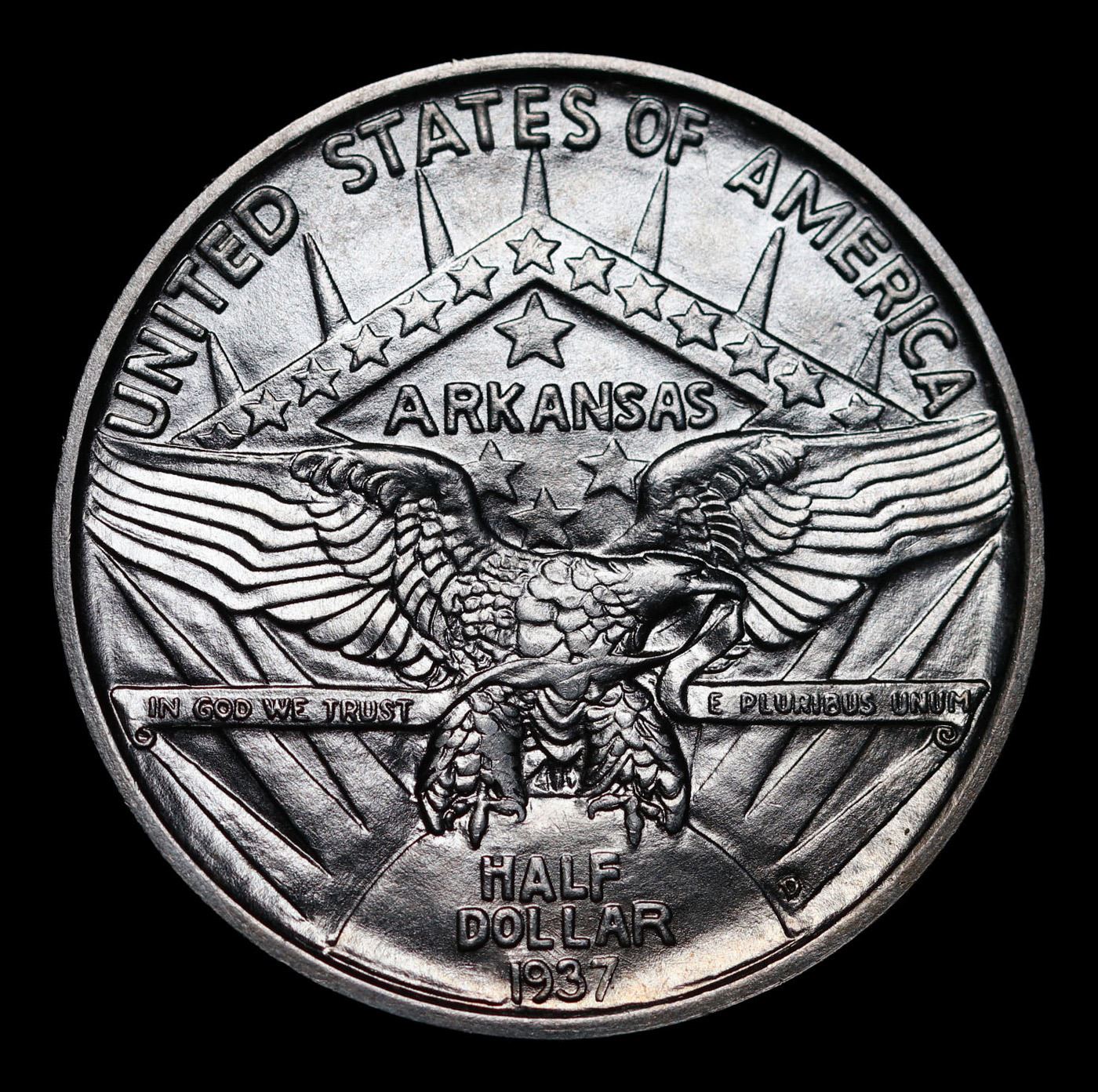 1937-d Arkansas Old Commem Half Dollar 50c Grades GEM+ Unc. Commemorative coins were authorized to celebrate the 100th anniversary of the admission of Arkansas into the Union. The Arkansas Centennial Half Dollars ended up being issued during five separate years, across three different mints. The coins became controversial due to the stream of variations created specifically to market to collectors, as well as the escalating issue prices as mintage for later issues became smaller.The obverse design features the head of Liberty and a Native American in headdress. Although this is now considered to be the obverse of the coin, there was initially some confusion and US Mint records and some references refer to this side as the reverse. In 1936, a new design was issued for this side of the coin, featuring a Senator who was living at the time of issue. The 1936 Robinson-Arkansas Half Dollar is considered a separate issue by most collectors.The reverse of the coin features the image of an eagle with wings spread, perched on the rising sun with rays emanating upwards. In the background a geometrical shape appears with the word “Arkansas” at center, amidst an arrangement of stars. Both the obverse and reverse design designed by Edward Everett Burr, following models prepared by Emily Bates.At the onset, the Arkansas Half Dollar was struck in a modest quantity of 13,012 pieces at the Philadelphia Mint with an additional 5,505 from Denver and 5,506 from San Francisco. The Philadelphia issues were sold at an issue price of $1 each, while the mint marked coins were purchased in a bulk transaction by a coin dealer and subsequently sold for $2.75 each. This initial situation was a taste of things to come.In the following year, coins from three different mints were initially offered for $1 each, but the price was quickly raised to $1.50 per coin, and eventually sold as sets of three coins for $6.75. The following year three coin sets were sold at $8.75, which was eventually raised to $10. This would also be the price of the 1939 sets.