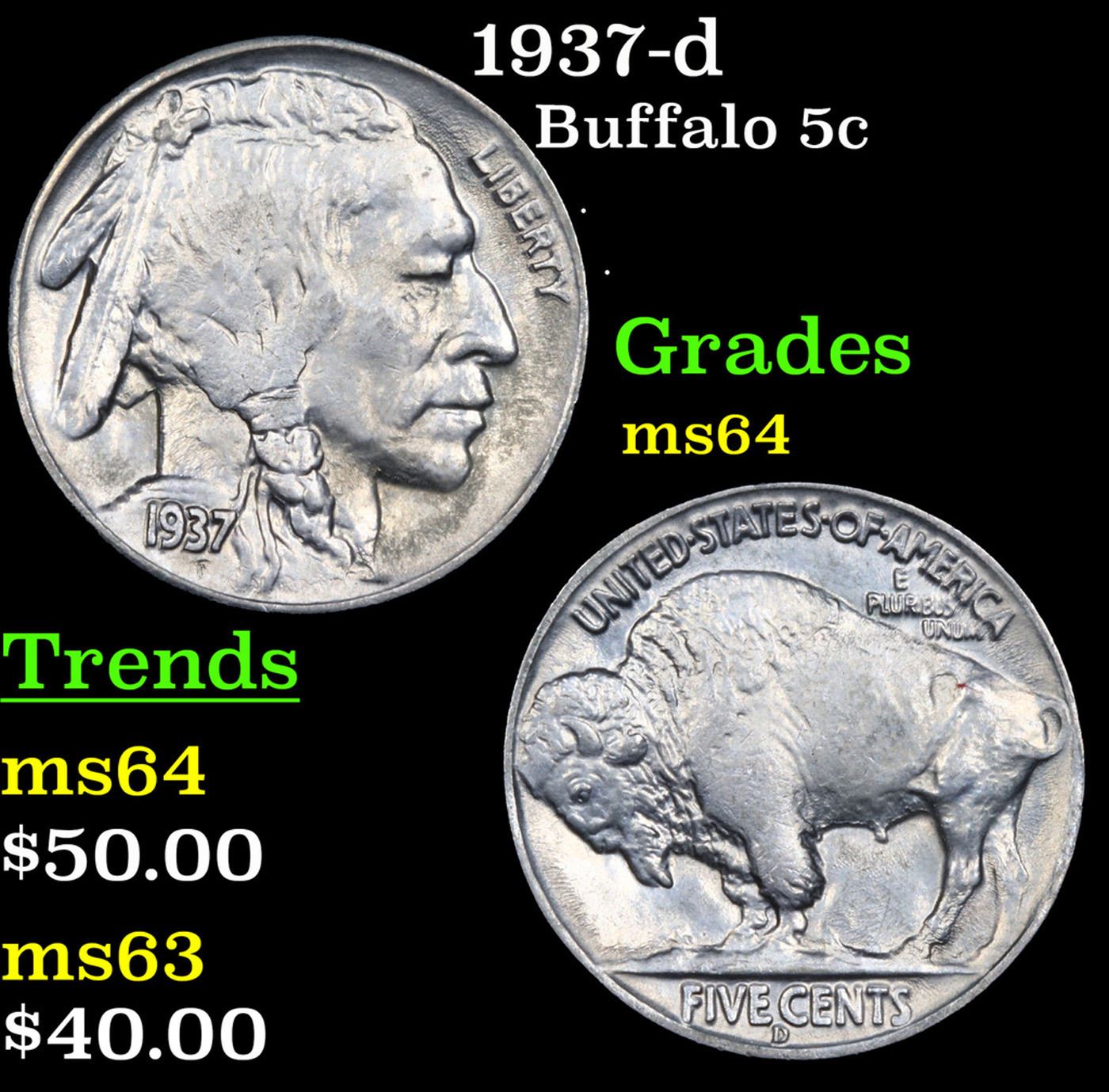 1937-d Buffalo Nickel 5c Grades Choice Unc.