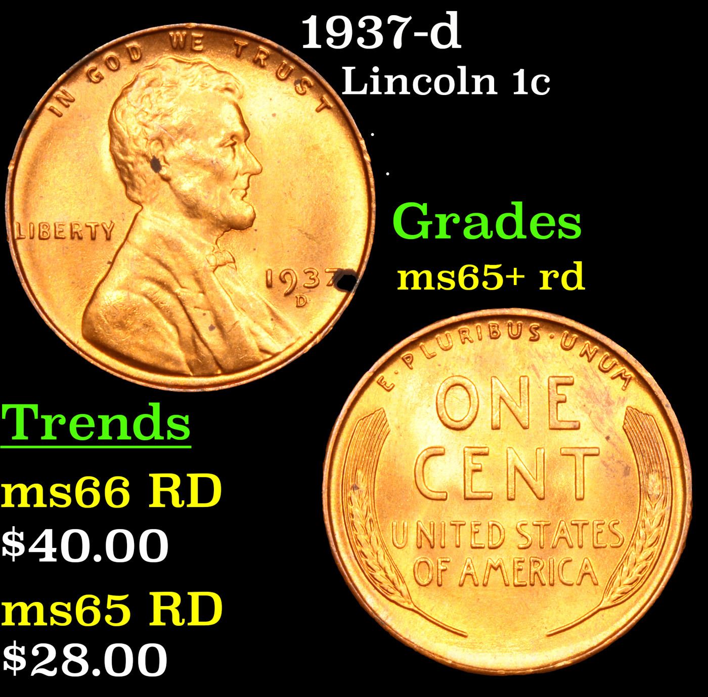 1937-d Lincoln Cent 1c Grades Gem+ Unc RD.