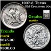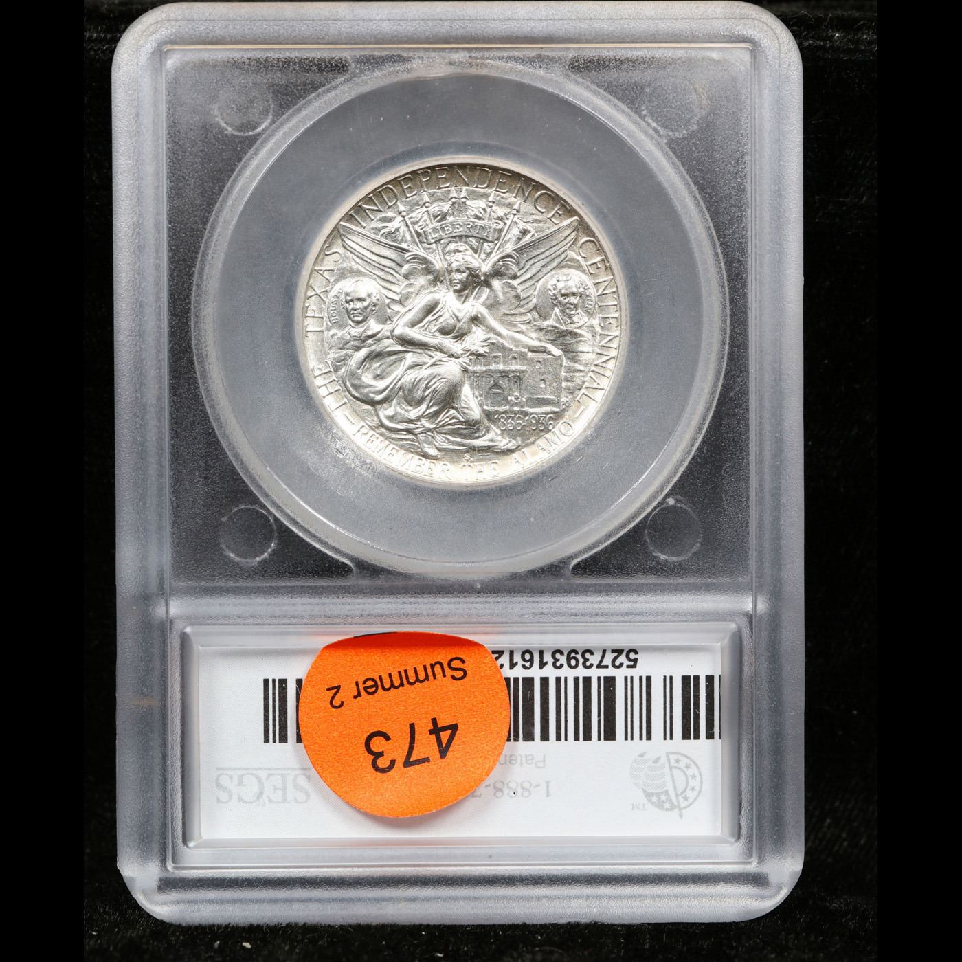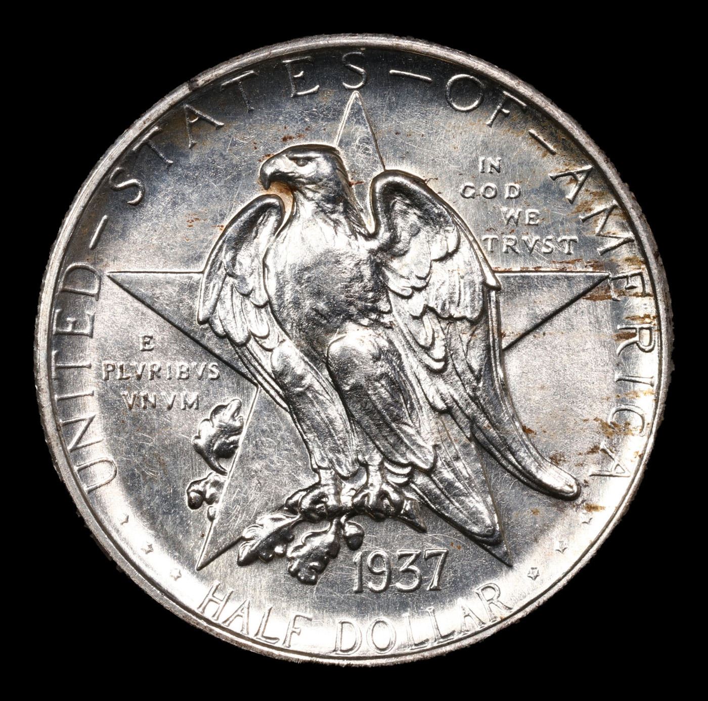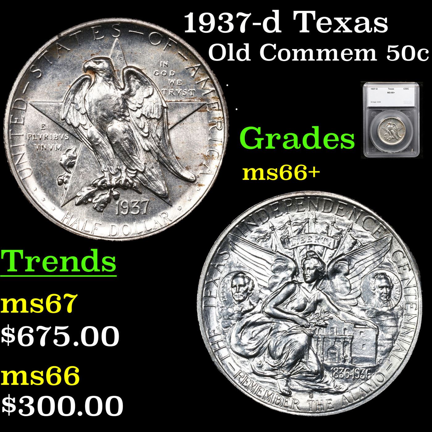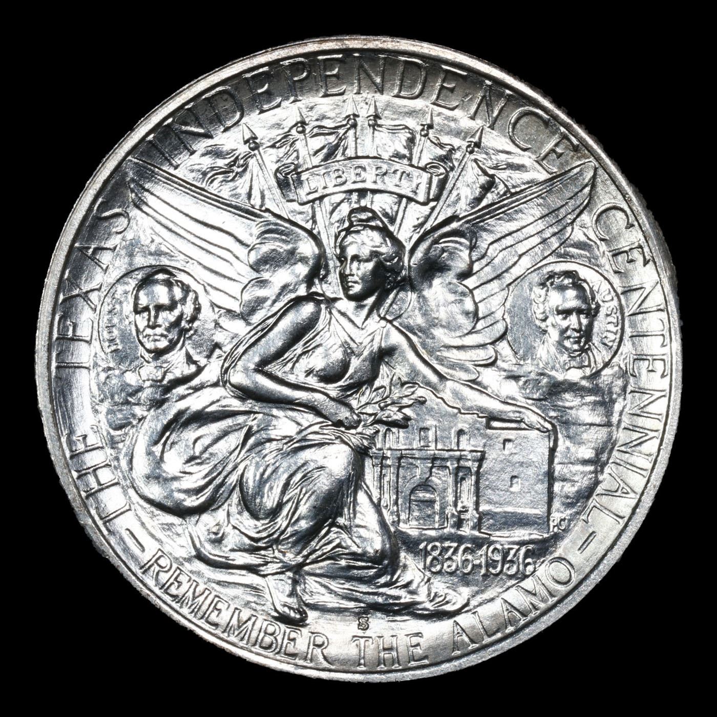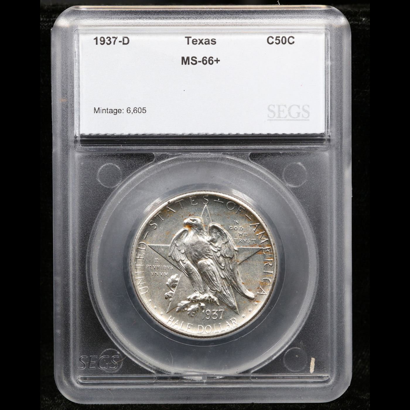 1937-d Texas Old Commem Half Dollar 50c Graded ms66+ By SEGS. The Texas Centennial half dollar commemorative coin was minted to honor the Centennial of Texas's independence from Mexico. Early in the administration of President Franklin Delano Roosevelt, on June 15, 1933, Congress passed an act to authorize the coinage of silver half dollars "in commemoration of the one hundredth anniversary in 1936 of the independence of Texas, and of the noble and heroic sacrifices of her pioneers, whose revered memory has been an inspiration to her sons and daughters during the past century." The Texas commemorative series ran from 1934 thru 1938 and 13 different dates and mint mark combinations were issued. For each of the years 1935 thru 1938, coins were struck at all three Mints; Philadelphia, Denver, and San Francisco. But for the 1934 Texas, only Philadelphia Mint coins were issued. The original issue price was $1.00 per coin.The coin was designed by Pompeo Coppini, a Texan. The obverse depicts an Eagle sitting on a branch in front of the Lone Star, the symbol of Texas. The reverse depicts the goddess Victory spreading her wings over the Alamo. It also depicts Sam Houston on her left and Stephen F. Austin on her right. The Six Flags of Texas fly above her head. Under her it reads REMEMBER THE ALAMO. Over Sam Houston, Victory, and Stephen F. Austin it reads THE TEXAS INDEPENDENCE CENTENNIAL.