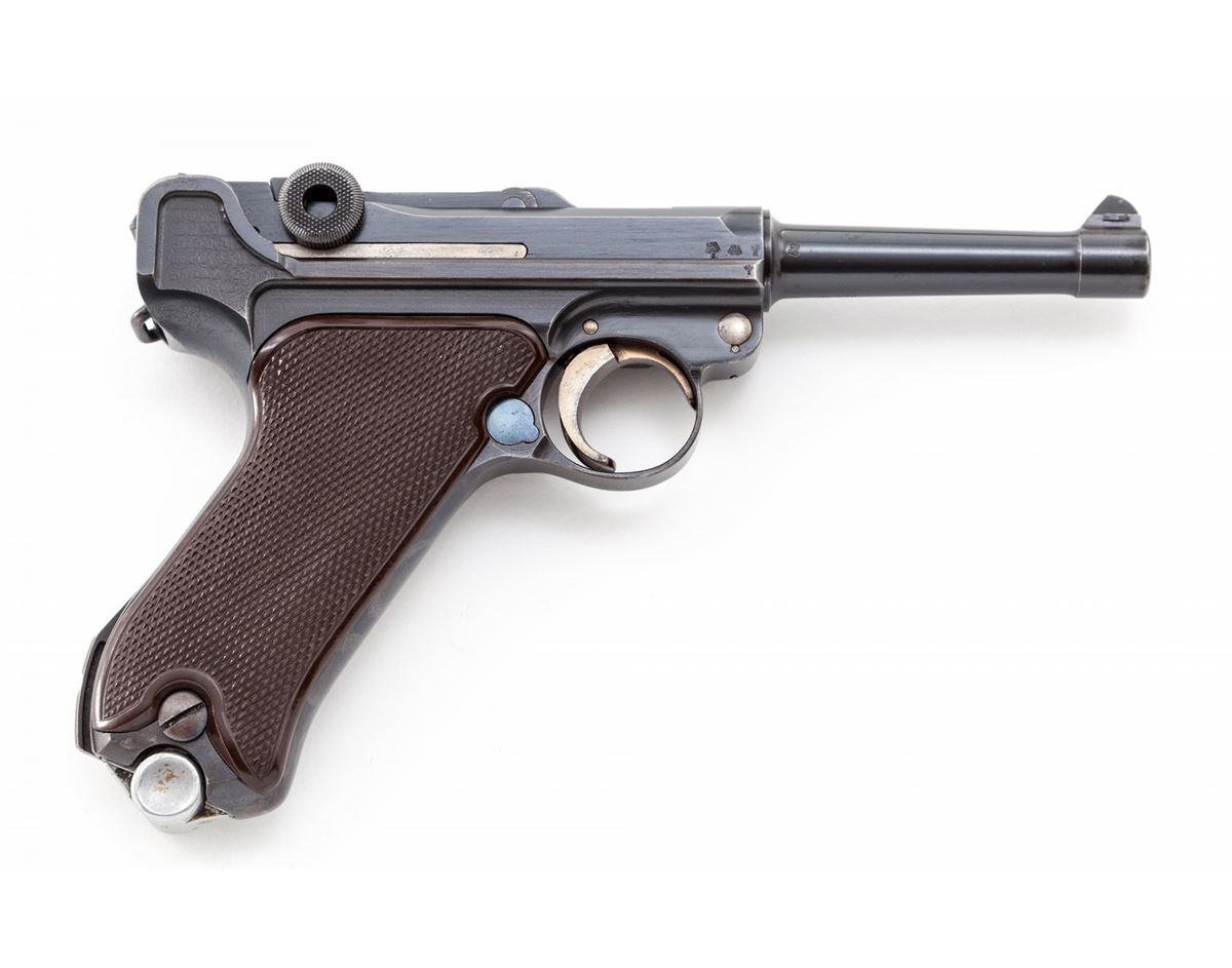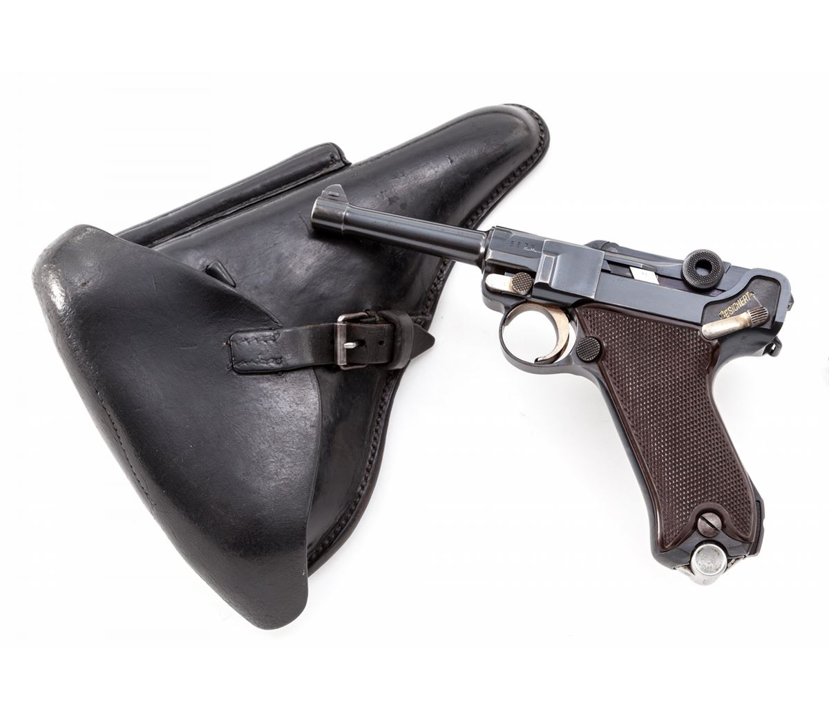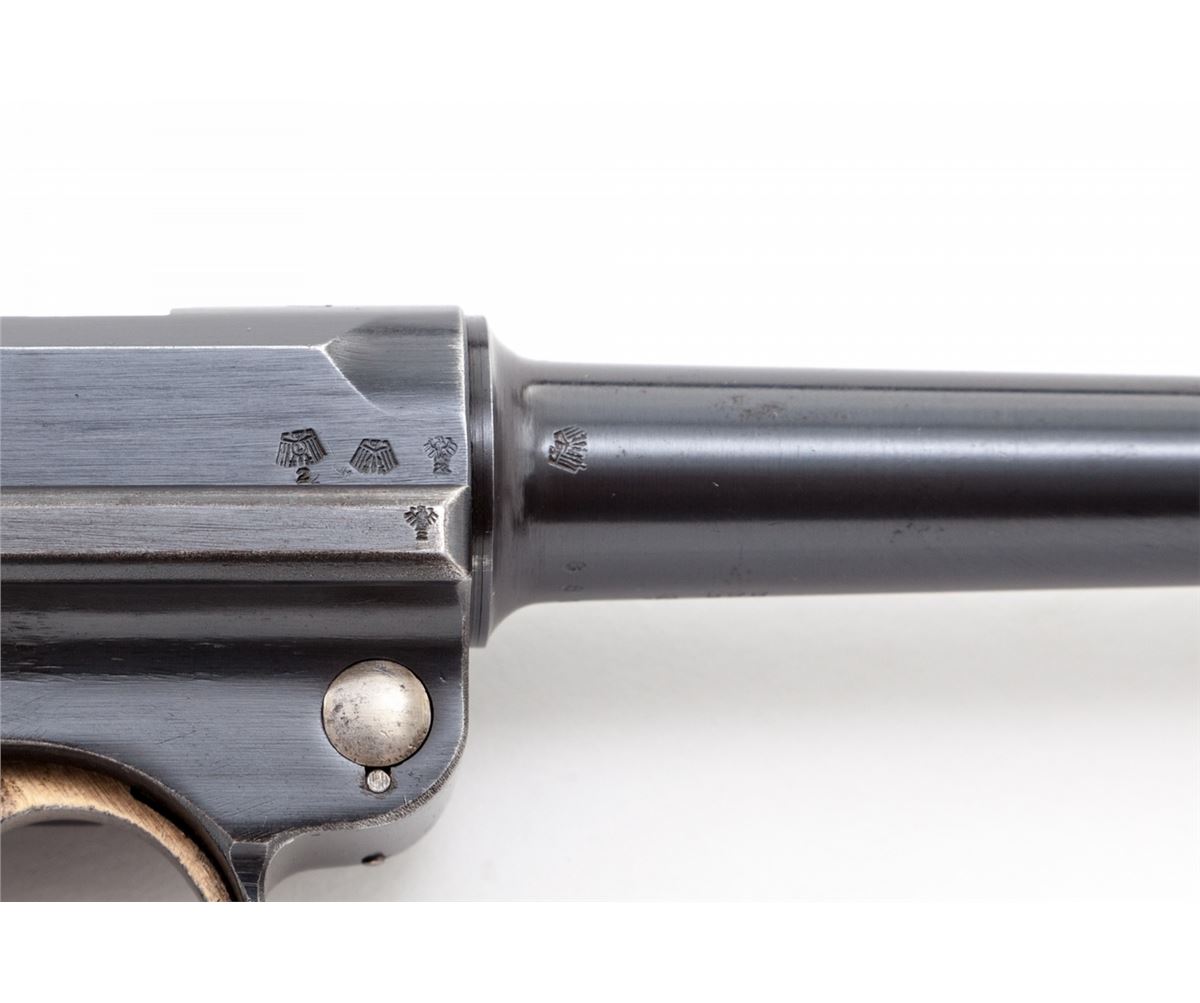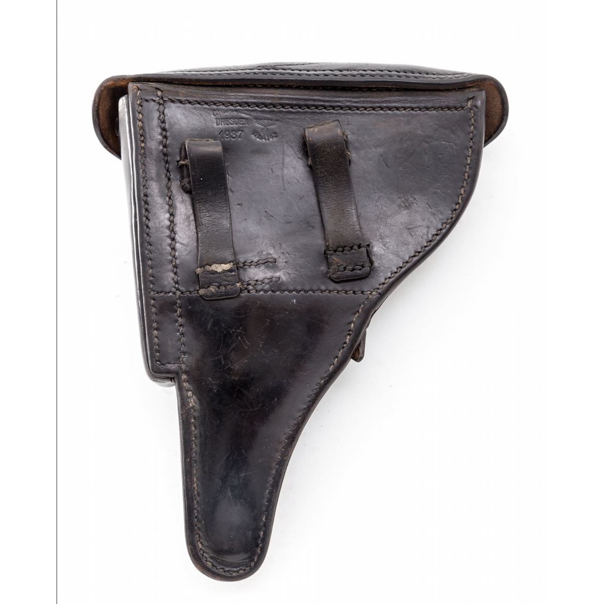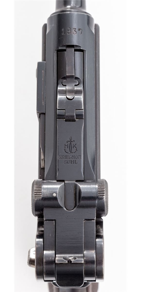 1937 dated Krieghoff Luger, #8877, 9mm, 4'' barrel, salt blue finish with straw small parts, brown checkered molded grips with smooth border, and two (2) bright extruded magazines with matching numbered aluminum bases, with one 1937 dated holster. Chamber area dated 1937, Krieghoff logo to central toggle link; frame, upper receiver and barrel with Luftwaffe inspection marks. Considered somewhat scarce with approx. 3000 mfg'd in 1937. Condition is excellent retaining approx. 97% original blue with wear at muzzle and high edges of sideplate, thinning to front and backstrap. Grips and action are crisp, bore is bright. One magazine may be force matched as its numbers are of a different height than the other. Holster shows evidence of applied polish, with light impressions and tight stitching. Est.: $5,000-$7,500. (C&R/PPT) (John Siroonian estate)